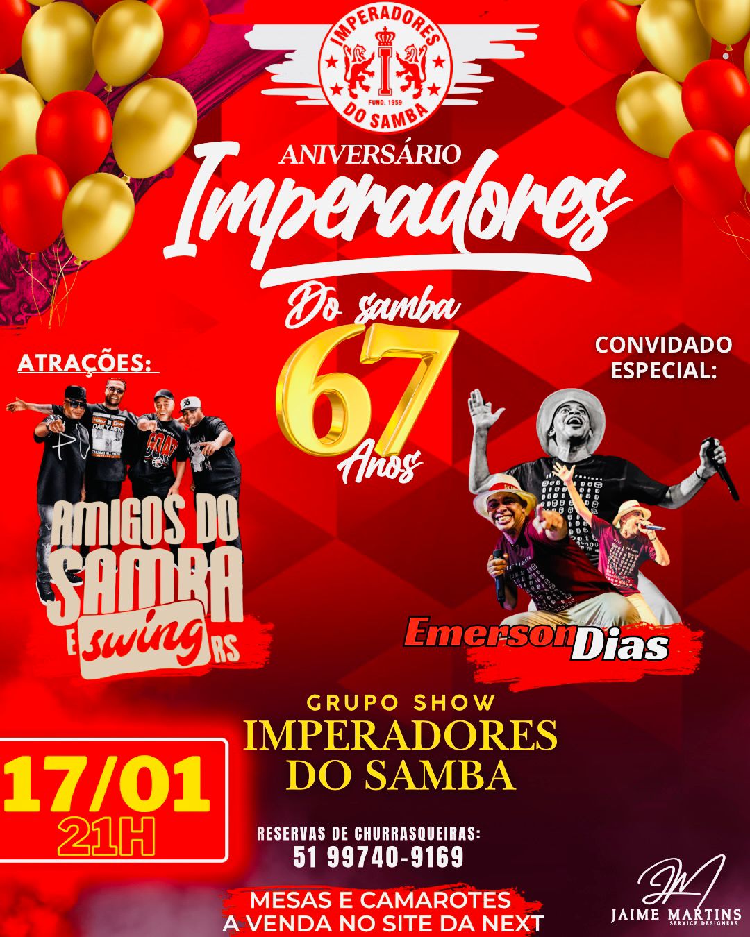 A celebração será em casa, na quadra da escola, avenida Padre Cacique, 1567, dia 17, a partir das 21 horas, com a apresentação do grupo Amigos do Samba e Swing RS, grupo show de Imperadores e o convidado especial, o intérprete Emerson Dias.